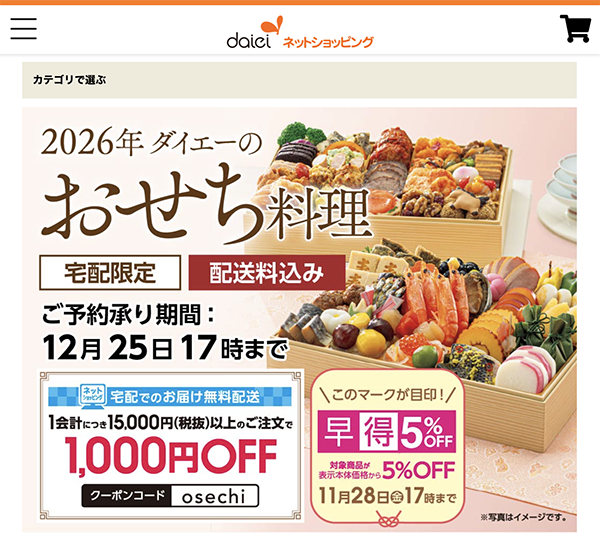 2026年ダイエーおせち料理 2026年ダイエーおせち料理について 新しい一年のはじまりを華やかに彩る「2026年ダイエーおせち料理」は、家族や親しい人とゆっくり過ごすお正月にぴったりの宅配限定商品です。配送料込みで届くため、重い荷物を運ぶ手間がなく、年末の準備をスマー... 2026年ダイエーおせち料理について 新しい一...